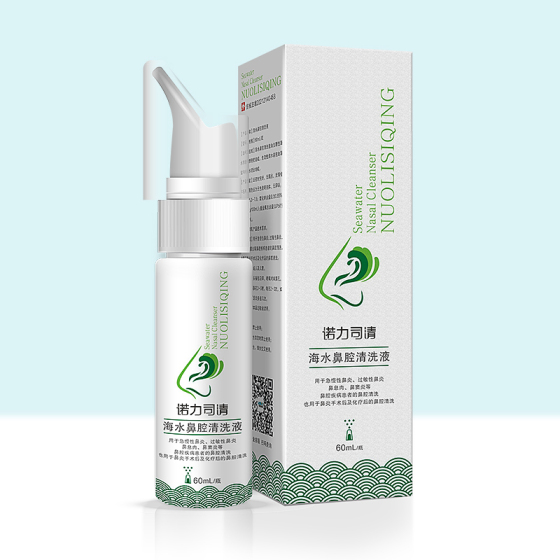 【产品名称】海水鼻腔清洗液【型号、规格】60mL/瓶【结构及组成】海水鼻腔清洗液由生理性海水溶液和储液瓶组成,生理性海水溶液由海盐和纯化水混合制成。【产品性能】应密封完好,无漏点、无锋棱和毛刺,颜色应为无色澄明液体,无异味。pH值应为5.0~7.8;氯化钠含量应为0.85%~0.95%(g/100mL);重金属总含量(以Pb计)应≤2μg/mL。其他内容详见产品技术要求。【适用范围】用于急慢性鼻炎、过敏性鼻炎、鼻息肉、鼻窦炎等鼻腔疾病患者的鼻腔清洗,也用于鼻炎手术后及化疗后的鼻腔清洗。【适用对象】成人及儿童。【使用方法】头稍往后仰,喷